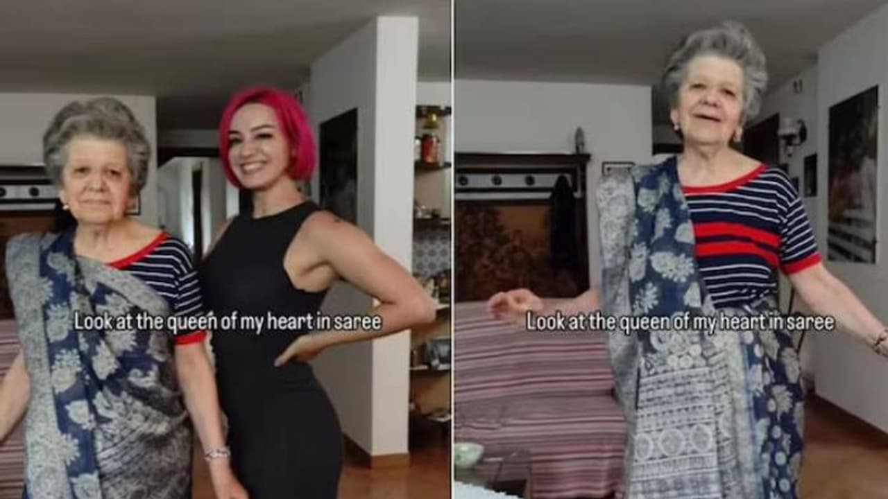 ഒരു ഇറ്റാലിയൻ യുവതി തന്റെ മുത്തശ്ശിയെ സാരിയുടുപ്പിക്കുന്നതാണ് വീഡിയോയിൽ കാണാൻ സാധിക്കുന്നത്. നമുക്കറിയാം, സാരി സാധാരണ ഇന്ത്യക്കാർ ധരിക്കുന്ന വസ്ത്രമാണ്. അത് ധരിക്കാനാവട്ടെ വലിയ പ്രയാസവുമാണ്. യുവതിയുടെ മുത്തശ്ശി 20 വർഷങ്ങൾക്ക് മുമ്പ് ഇന്ത്യയിൽ വന്നതാണ്. അന്നുമുതലേ അവരുടെ വലിയ ആഗ്രഹമായിരുന്നത്രെ ഇന്ത്യക്കാരായ സ്ത്രീകൾ സാധാരണ ധരിക്കുന്ന സാരി ഒന്ന് ധരിച്ചുനോക്കണം എന്ന്. സിദ്ധ പല്ലു വരുന്ന നൗവാരി സാരിയാണ് മുത്തശ്ശി ധരിക്കുന്നത്.