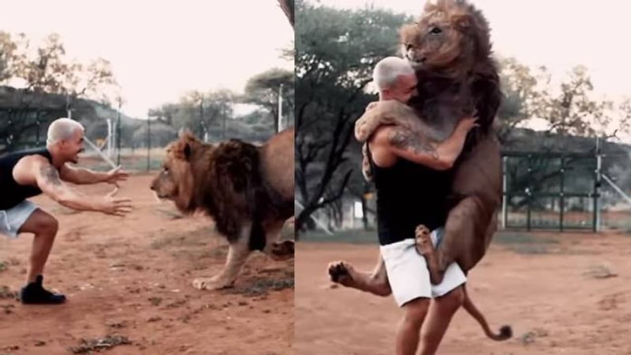 വളർത്തുമൃഗങ്ങളായ പൂച്ചയും പട്ടിയും ഒക്കെ മനുഷ്യരെ അത്യധികം ആവേശത്തോടെയും സ്നേഹത്തോടെയും കെട്ടിപ്പിടിക്കാറുണ്ട് അല്ലേ? എന്നാൽ, ഒരു സിംഹം അത് ചെയ്യുന്നത് തികച്ചും അത്ഭുതം എന്നേ പറയാൻ കഴിയൂ. മനുഷ്യരും മൃഗങ്ങളും തമ്മിൽ നിരന്തരം സംഘട്ടനം നടക്കുന്ന ഈ കാലത്ത് ഇങ്ങനെ ഒരു വീഡിയോ കണ്ടത് ആളുകളെ തെല്ലൊന്നുമല്ല സന്തോഷിപ്പിച്ചത്. എന്നാലും, സിംഹം ഓടിവന്ന് മനുഷ്യനെയൊക്കെ കേട്ടിപ്പിടിക്കുമോ എന്ന് സംശയിക്കുന്നവരുണ്ടാകും.