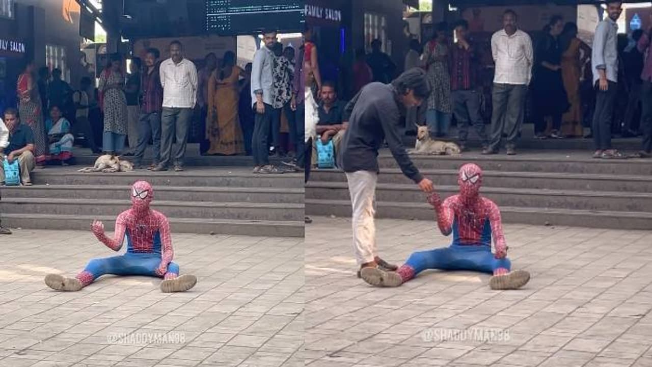 അതിൽ ഏറ്റവും ഒടുവിലായി സ്പൈഡർമാൻ യാചിക്കുന്ന രംഗമാണ് പകർത്തിയിരിക്കുന്നത്. മഹാരാഷ്ട്രയിലെ കല്യാൺ സ്റ്റേഷന് മുന്നിൽ നിന്നാണ് ഈ രംഗം പകർത്തിയിരിക്കുന്നത്. 'ആരെങ്കിലും ഈ സ്പൈഡർമാന് ഭിക്ഷ നൽകൂ' എന്ന കാപ്ഷനോട് കൂടിയാണ് വീഡിയോ ഇൻസ്റ്റഗ്രാമിൽ ഷെയർ ചെയ്തിരിക്കുന്നത്. shaddyman98 എന്ന യൂസറാണ് വീഡിയോ ഷെയർ ചെയ്തിരിക്കുന്നത്. വീഡിയോയിൽ കാണുന്നത് സ്പൈഡർമാൻ വേഷമിട്ട യുവാവ് സ്റ്റേഷന് മുന്നിലിരുന്ന് കൈനീട്ടി യാചിക്കുന്നതാണ്.
