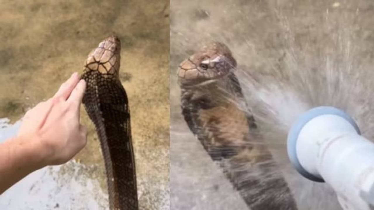 അതുപോലെ, നമ്മുടെ കണ്ണുതള്ളിക്കുന്ന ഒരു വീഡിയോയാണ് ഇപ്പോൾ സോഷ്യൽ മീഡിയയിൽ വൈറലായിക്കൊണ്ടിരിക്കുന്നത്. നമുക്കറിയാം, ലോകത്തിലെ തന്നെ ഏറ്റവും നീളമേറിയ വിഷപ്പാമ്പാണ് രാജവെമ്പാല. ഒരുവിധം മനുഷ്യർക്കെല്ലാം അതിനെ പേടിയായിരിക്കും. സാധാരണ നിലയ്ക്ക് മനുഷ്യരെ അങ്ങനെ ഉപദ്രവിക്കാത്ത രാജവെമ്പാല പക്ഷേ പ്രകോപിതരായാൽ കാര്യം മാറും. മാത്രമല്ല, നല്ല വിഷമുള്ള പാമ്പുകളുമാണ് ഇവ. ആ രാജവെമ്പാലയെ കുളിപ്പിക്കുന്നതിനെ കുറിച്ച് ചിന്തിക്കാനാവുമോ? എന്നാൽ, അങ്ങനെ കുളിപ്പിക്കുന്നൊരു വീഡിയോയാണ് ഇപ്പോൾ വൈറലായിക്കൊണ്ടിരിക്കുന്നത്.