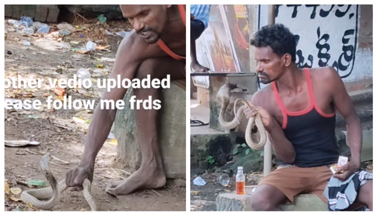 കാകി വെങ്കിടേഷ് എന്ന ഇന്സ്റ്റാഗ്രാം അക്കൌണ്ടില് നിന്നും പങ്കുവച്ച മറ്റൊരു വീഡിയോയില് ഇയാള് പാമ്പിനെ ഒരു കൈ കൊണ്ട് പിടിച്ച് തന്റെ മുഖത്തിന് സമീപത്തേക്ക് ഉയര്ത്തുന്നതും കാണാം. സംഭവത്തിന്റെ വീഡിയോ മൂന്നാല് പാര്ട്ട് ആയിട്ടാണ് ഇന്സ്റ്റാഗ്രാമില് പങ്കുവച്ചത്. ഓരോ വീഡിയോയിലും ഇയാള് തന്റെ മുന്നില് പത്തിവിടര്ത്തി നില്ക്കുന്ന മൂര്ഖന് പാമ്പിനെ മുന്നിലേക്ക് തന്റെ കൈകൊണ്ടുപോകുന്നതും കാണാം. ദശലക്ഷക്കണക്കിന് ആളുകളാണ് വീഡിയോകണ്ടത്. 'പാമ്പും 90 മില്ലിക്കായി കാത്തിരിക്കുന്നു' എന്നായിരുന്നു ഒരു കാഴ്ചക്കാരന് എഴുതിയത്. 'പാമ്പ് ചിന്തിക്കുന്നത്, എന്തുകൊണ്ട് ഇവന് എന്നെ ഭയപ്പെടുന്നില്ല?' എന്നായിരുന്നു മറ്റൊരു കാഴ്ചക്കാരന് കുറിച്ചത്. ആന്ധ്രാപ്രദേശിലെ സത്യസായി ജില്ലയിലെ കദിരിയിൽ നിന്നുള്ള നാഗരാജു എന്ന യുവാവാണ് വീഡിയോയില് ഉള്ളത്. മദ്യ ലഹരിയിലായിരുന്ന ഇയാള് കാട്ടിലേക്ക് കയറിപ്പോവുകയായിരുന്ന മൂര്ഖന് പാമ്പിനെ പിടിച്ച് തന്റെ അടുത്ത് ഇരുത്തുകയായിരുന്നുവെന്ന് റിപ്പോര്ട്ടുകള് പറയുന്നു. പിന്നീട് ദേഹാസ്വാസ്ഥ്യം തോന്നിയ ഇയാളെ ആശുപത്രിയിലാക്കിയെന്ന ന്യൂസ് 18 റിപ്പോര്ട്ട് ചെയ്യുന്നു. എന്നാല് കൂടുതല് വിവരങ്ങള് ലഭ്യമല്ല.