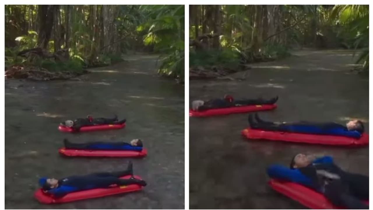 നിറയെ മരങ്ങള് നിറഞ്ഞ അവിടെയും ഇവിടെയും മാത്രം സൂര്യപ്രകാരം വീഴുന്ന ഒരു കാട്ടരുവിലിയൂടെ സ്ലിപിംഗ് ബാഗുകളില് കിടന്ന് ഒഴുകിപ്പോകുന്ന മൂന്ന് പേരുടെ കാഴ്ച ആളുകള് ഇരുകൈയും നീട്ടി സൂക്ഷിച്ചു.