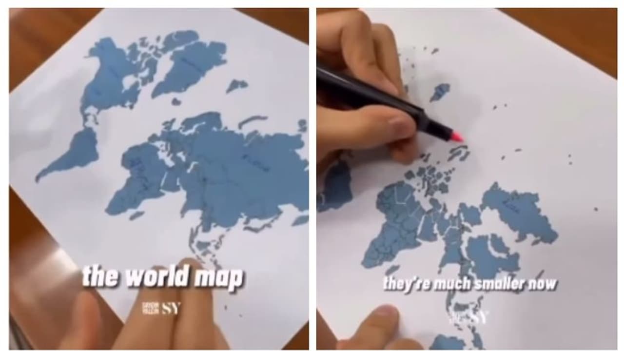 ഭൂപടനിര്മ്മിതിക്ക് വിവിധ സ്കെയിലാണ് ഉപയോഗിക്കപ്പെട്ടുന്നത്. അതിനാല് രാജ്യങ്ങളുടെ അടയാളപ്പെടുത്തലുകളിലും ഭൂ വിസ്തൃതിയിലും കാര്യമായ വ്യത്യാസങ്ങള് ഭൂപടങ്ങളിലുണ്ടാകുന്നുവെന്ന് വിശദീകരിച്ച് കൊണ്ട് _newnormal_world എന്ന ഇന്സ്റ്റാഗ്രാം ഉപയോക്തവ് പങ്കുവച്ച വീഡിയോ സാമൂഹിക മാധ്യമത്തില് വൈറലായി. വീഡിയോ പങ്കുവച്ച് കൊണ്ട് ന്യൂനോര്മല് വേള്ഡ് ഇങ്ങനെ കുറിച്ചു, 'സ്കൂൾ = ബിഎസ്, അവർക്ക് ശരിയായ ലോക ഭൂപടം പഠിപ്പിക്കാൻ പോലും കഴിയില്ല. അവർ അതിനെക്കുറിച്ച് കള്ളം പറയുകയാണെങ്കിൽ, അവർ മറ്റെന്തിനെ കുറിച്ചാണ് നുണ പറയാത്തത്?' വീഡിയോയില് ഒരാള് ലോക ഭൂപടത്തിന്റെ 2D ചിത്രം കാണിച്ച് വിശദീകരിക്കുന്നു. യൂറോപ്പില് നിന്ന് റഷ്യയുടെ മറുഭാഗത്തേക്കുള്ള ദൂരം 6,400 കിലോമീറ്റര്. ഈ ഭൂഭാഗമാണ് എല്ലാ ഭൂപടങ്ങളിലും ഏറ്റവും കൂടുതലായി ചിത്രീകരിച്ചിട്ടുള്ളത്. എന്നാല് 7200 കിലോമീറ്റർ നീളമുള്ള ആഫ്രിക്കയുടെ മുകള് ഭാഗം ഇതിന്റെ പകുതി മാത്രമേ അടയാളപ്പെടുത്തിയിട്ടൊള്ളൂവെന്നും അദ്ദേഹം വ്യക്തമാക്കുന്നു. അളവുകളിലെ ഈ പൊരുത്തമില്ലായ്മ ഗ്രീൻലാൻഡിന്റെ കാര്യത്തിലും അമേരിക്കന് ഭൂഖണ്ഡത്തിന്റെ കാര്യത്തിലുമുണ്ടെന്നും അദ്ദേഹം കൂട്ടിച്ചേര്ക്കുന്നു. പിന്നാലെ തന്റെ സിദ്ധാന്തപ്രകാരം യഥാര്ത്ഥ ഭൂഖണ്ഡ ചിത്രം എന്ന് വ്യക്തമാക്കി അദ്ദേഹം മറ്റൊരു ഭൂപടം കാണിക്കുന്നു. നിലവില് ലോകത്തുണ്ടായിട്ടുള്ള എല്ലാ ഭൂപടങ്ങളെയും പൊളിച്ചെഴുതുന്ന ഒരു ചിത്രമായിരുന്നു അത്.