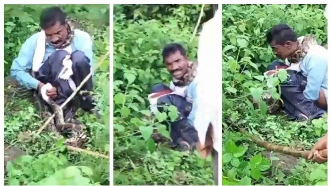 തുറസ്സായ സ്ഥലത്ത് മലമൂത്ര വിസർജനം നടത്തുന്നതിനിടെ പാമ്പ് പുറകിൽ നിന്നും എത്തി ഇയാളുടെ കഴുത്തില് വാല് ചുറ്റുകയായിരുന്നു.