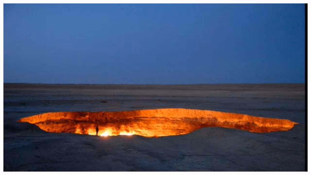 തുർക്ക്മെനിസ്ഥാനിലെ 'നരകവാതിൽ' എന്നറിയപ്പെടുന്ന ദർവാസ ഗ്യാസ് ക്രേറ്റർ 1971-ലെ ഒരു സോവിയറ്റ് ഡ്രില്ലിംഗ് അപകടത്തെ തുടർന്ന് രൂപപ്പെട്ടതാണ്. വിഷവാതകം കത്തിച്ചുകളയാൻ ശ്രമിച്ചപ്പോൾ തുടങ്ങിയ തീ അഞ്ച് പതിറ്റാണ്ടിലേറെയായി അണയാതെ കത്തുന്നു.