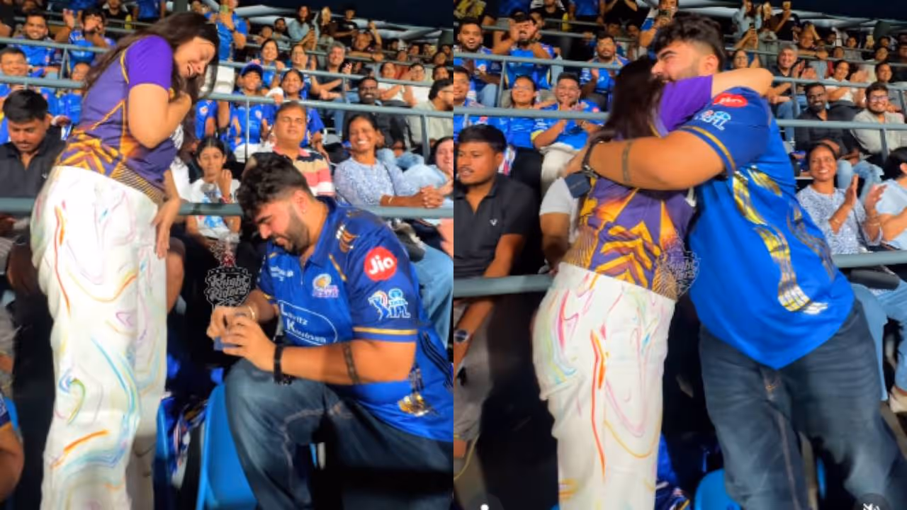 മുംബൈയിലെ വാംഖഡെ സ്റ്റേഡിയത്തിൽ നടന്ന മുംബൈ ഇന്ത്യൻസ് - കൊൽക്കത്ത നൈറ്റ് റൈഡേഴ്സ് മത്സരത്തിനിടെ നടന്ന നാടകീയമായ ഒരു പ്രൊപ്പോസലിന്റെ വീഡിയോയാണ് ഇപ്പോൾ സോഷ്യൽ മീഡിയയിൽ വൈറലാവുന്നത്.
