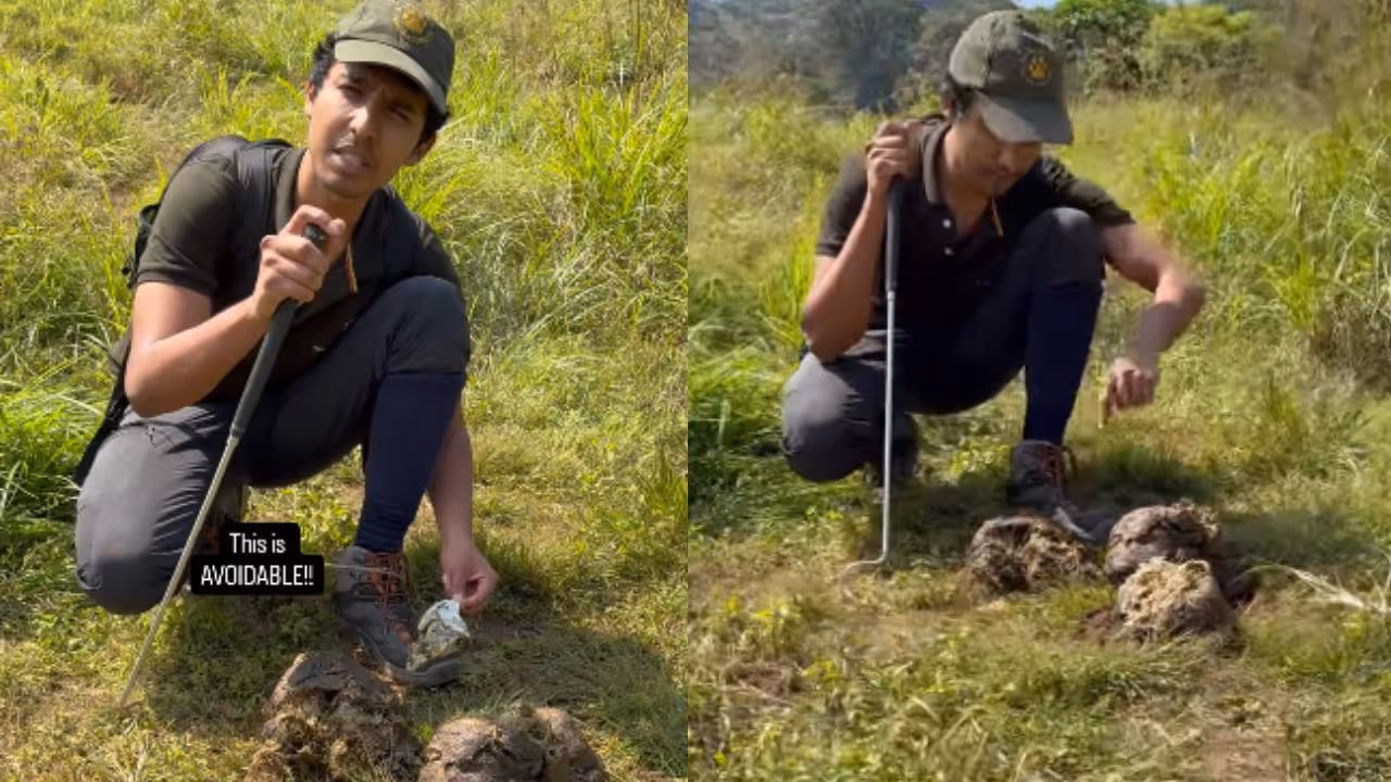 കർണാടകയിലെ ബ്രഹ്മഗിരി കുന്നുകളിലെ വനത്തിൽ നിന്നും കണ്ടെത്തിയ ആനപ്പിണ്ടത്തിനുള്ളിലെ പ്ലാസ്റ്റിക് മാലിന്യം. വീഡിയോ ഷെയര് ചെയ്ത് യുവാവ്. മനുഷ്യർ കാടുകളിൽ പോലും മാലിന്യം വലിച്ചെറിയുന്നുവെന്ന് കാണിക്കുന്ന വീഡിയോ വലിയ ശ്രദ്ധയാണ് നേടിയത്.