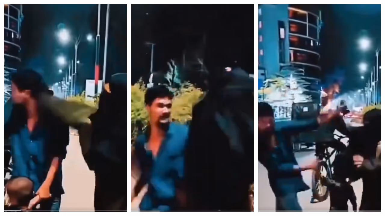 ബുർഖ ധരിച്ച ഒരു സ്ത്രീയും പുരുഷനും തമ്മിലായിരുന്നു സംഘര്ഷം. ഈ സമയം റോഡിലൂടെ പോകുന്നവര് ഇരുവരുടെയും സംഘര്ഷം നോക്കിനില്ക്കുന്നതല്ലാതെ ഇടപെടാന് തയ്യാറാകുന്നില്ല. വീഡിയോയില് ഒരു കൊച്ച് കുട്ടിയുടെ കൈയും പിടിച്ച് ബുർഖ ധരിച്ച സ്ത്രീയോട് സംസാരിച്ച് നിൽക്കുന്ന ഒരു യുവാവിനെ കാണാം. കാഴ്ചയില് ഇരുവരും ഭാര്യഭര്ത്താക്കന്മാരാണെന്ന സംശയം ഉയർത്തുമെങ്കിലും അത് സംബന്ധിച്ച സ്ഥിരീകരണം വീഡിയോയിലില്ല.