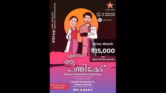 ഡാന്സിലൂടെ സോഷ്യല് മീഡിയയില് വൈറലായ മെഡിക്കല് വിദ്യാര്ഥികള്ക്ക് പിന്തുണയുമായി കൊച്ചിന് യൂണിവേഴ്സിറ്റി എസ്എഫ്ഐയുടെ ഡാന്സ് ചലഞ്ച്. 'എന്തോ ഒരു പന്തികേട്' എന്ന പേര് ഇട്ടിരിക്കുന്ന മത്സരത്തിലേക്ക് നിരവധി കോളേജ് വിദ്യാര്ഥികളാണ് എന്ട്രികള് അയക്കുന്നത്