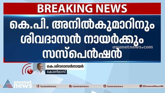 കെ.പി.അനില്കുമാറിനും ശിവദാസന് നായര്ക്കും സസ്പെന്ഷന്; നടപടി ന്യൂസ് അവറിലെ പ്രതികരണത്തെ തുടര്ന്ന്. 'നേതാക്കള്ക്കെതിരെ പ്രതികരിച്ചിട്ടില്ല , സംഘടനയെ ശക്തിപ്പെടുത്തുന്ന അഭിപ്രായം തുറന്നുപറയുകയാണ് ചെയ്തതെ'ന്ന് ശിവദാസന്