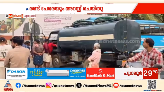 കോഴിക്കോട് പുതുപ്പാടിയിൽ ശുചിമുറി മാലിന്യം തള്ളിയ സംഭവം; ടാങ്കർ ലോറി പിടിക്കൂടി നാട്ടുകാർ; രണ്ട് പേരെ സംഭവത്തിൽ പൊലീസ് അറസ്റ്റ് ചെയ്തു