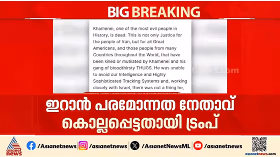 ചരിത്രത്തിലെ ഏറ്റവും തിന്മ നിറഞ്ഞ മനുഷ്യനെ വധിച്ചു, ഇറാനിൽ മാത്രമല്ല ലോകം മുഴുവനും ലഭിച്ച നീതി, ആക്രമണം തുടരും; ആയത്തുള്ള ഖമനെയി കൊല്ലപ്പെട്ടെന്ന് ട്രൂത്ത് സോഷ്യലിലൂടെ ട്രംപിന്റെ പ്രസ്താവന