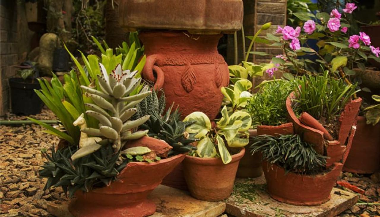 പൊട്ടിപ്പോയ ചട്ടികള് മാത്രം പ്രത്യേക രീതിയില് ചേര്ത്തുവെച്ച് മണ്ണ് നിറച്ച് ചെടികള് വളര്ത്തിയിരിക്കുന്നതും കൗതുകമാണ്. ഓരോ ചെറിയ പ്ലാസ്റ്റിക് കപ്പുകളിലും മണ്ണ് നിറച്ച് ചെടികള് വളര്ത്തി വിവിധ വര്ണങ്ങളിലുള്ള കല്ലുകളും ചെറിയ ചെറിയ മൃഗങ്ങളുടെ രൂപങ്ങളും ചേര്ത്തുവെച്ചിരിക്കുന്നു. ചെടി നടാനുപയോഗിക്കുന്ന പാത്രങ്ങളുടെ പുറത്ത് കക്കകള് ഒട്ടിച്ചുവെച്ചിരിക്കുന്നതും ഭംഗിയുള്ള കാഴ്ച തന്നെ.