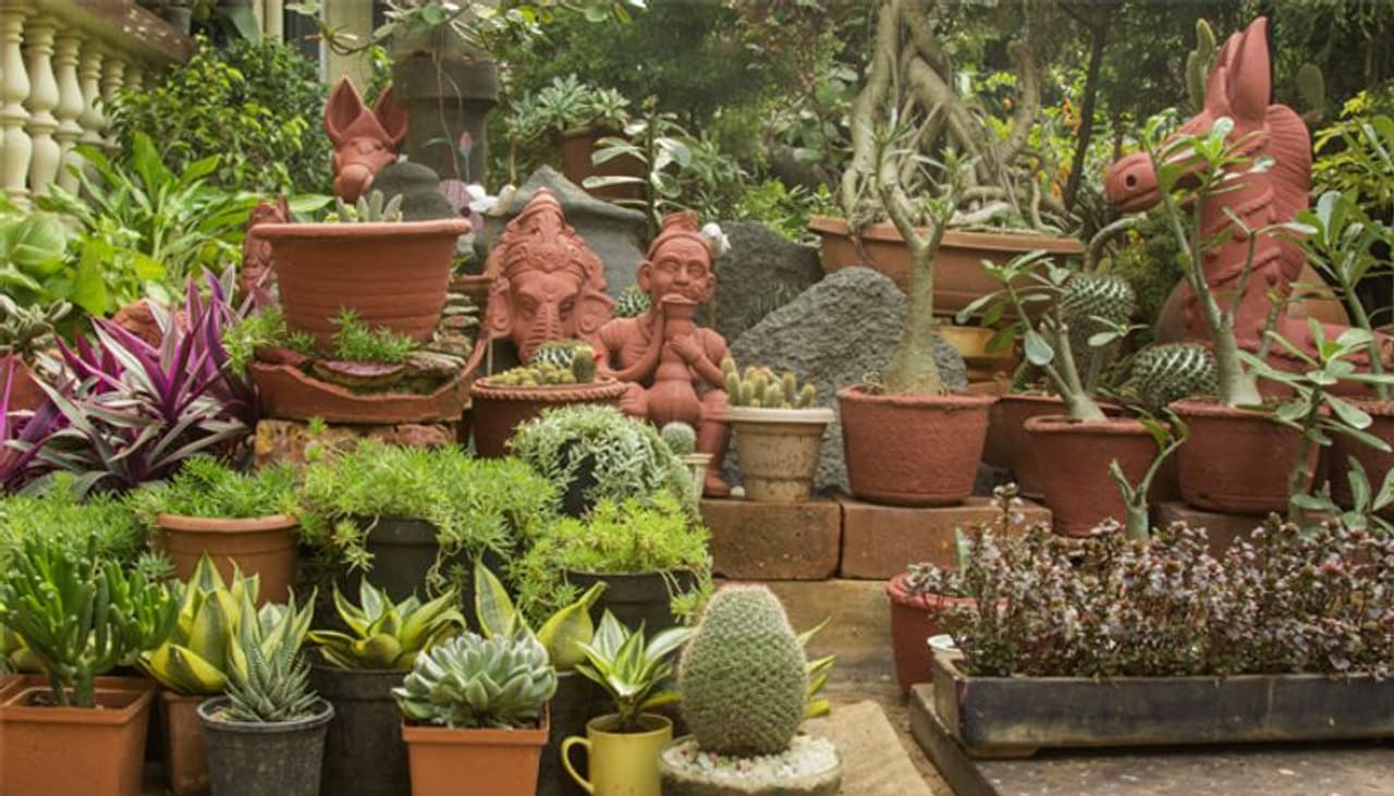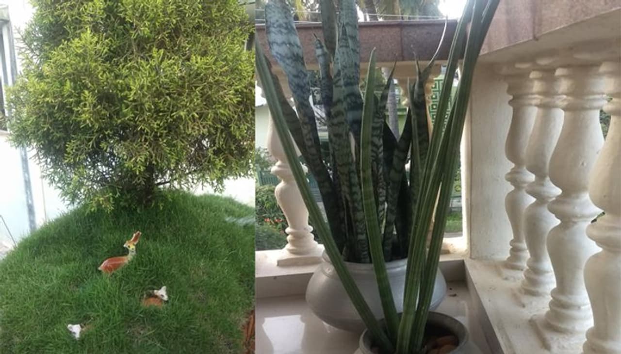 പൊട്ടിപ്പോയ ചട്ടികള് മാത്രം പ്രത്യേക രീതിയില് ചേര്ത്തുവെച്ച് മണ്ണ് നിറച്ച് ചെടികള് വളര്ത്തിയിരിക്കുന്നതും കൗതുകമാണ്. ഓരോ ചെറിയ പ്ലാസ്റ്റിക് കപ്പുകളിലും മണ്ണ് നിറച്ച് ചെടികള് വളര്ത്തി വിവിധ വര്ണങ്ങളിലുള്ള കല്ലുകളും ചെറിയ ചെറിയ മൃഗങ്ങളുടെ രൂപങ്ങളും ചേര്ത്തുവെച്ചിരിക്കുന്നു.
