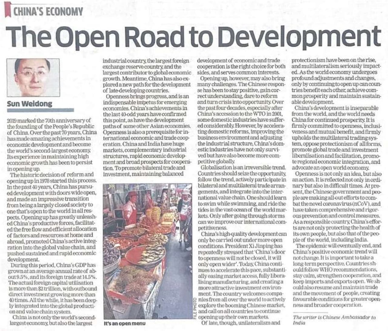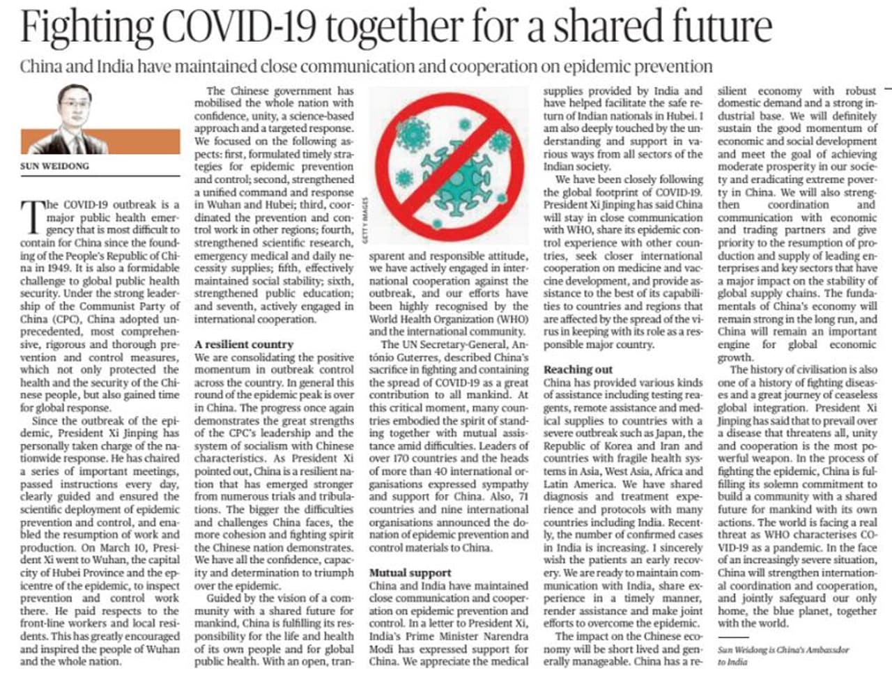 ഇവയില് സ്വരവൈവിധ്യം ഒട്ടും തിരിച്ചറിയാന് സാധിക്കാത്ത ഒന്നാണ് ജനുവരി 29-ന് 'ദി ഇന്ത്യന് എക്സ്പ്രസ്സില്' പ്രസിദ്ധീകരിച്ച ലേഖനം. കൊറോണ വൈറസ് ബാധ വുഹാനിലും, ചൈനയിലെ മറ്റു പ്രദേശങ്ങളിലും കൊടുമ്പിരിക്കൊള്ളുകയും ഇന്ത്യയുള്പ്പടെ ലോകത്തിലെ മറ്റു ഭാഗങ്ങളിലേക്ക് പടരുമെന്ന ആകാംക്ഷ നിലനില്ക്കുകയും ചെയ്യവേ എങ്ങും തൊടാത്ത വെറും രണ്ടു വരികള് മാത്രമാണ് സ്ഥാനപതി ഇക്കാര്യം പറയാന് നീക്കിവച്ചത്. ലേഖനത്തിലുടനീളം ചൈനയുടെ 'സമാധാനപരമായ വികസനമാണ്' സംസാര വിഷയം. ചൈനീസ് ഭരണകൂടത്തിന്റെ വൈറസ് പ്രതിരോധ വിശദാംശങ്ങളറിയാന് ലോകം താല്പര്യപെടുമ്പോള്, ഇത്തരത്തിലുള്ള മൗനവും വസ്തുതകളോടുള്ള പ്രഹസനവും കൃത്യമായ ഉത്തരവാദിത്വത്തില് നിന്നുള്ള ഒഴിഞ്ഞുമാറ്റമായേ കണക്കാക്കാന് സാധിക്കു.