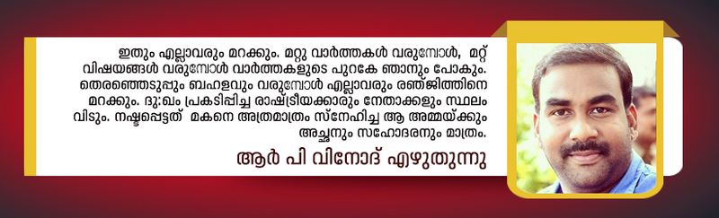 ഇതും എല്ലാവരും മറക്കും. മറ്റു വാര്ത്തകള് വരുമ്പോള്, മറ്റ് വിഷയങ്ങള് വരുമ്പോള് വാര്ത്തകളുടെ പുറകേ ഞാനും പോകും. തെരഞ്ഞെടുപ്പും ബഹളവും വരുമ്പോള് എല്ലാവരും രഞ്ജിത്തിനെ മറക്കും. ദു:ഖം പ്രകടിപ്പിച്ച രാഷ്ട്രീയക്കാരും നേതാക്കളും സ്ഥലം വിടും. നഷ്ടപ്പെട്ടത് മകനെ അത്രമാത്രം സ്നേഹിച്ച ആ അമ്മയ്ക്കും അച്ഛനും സഹോദരനും മാത്രം.