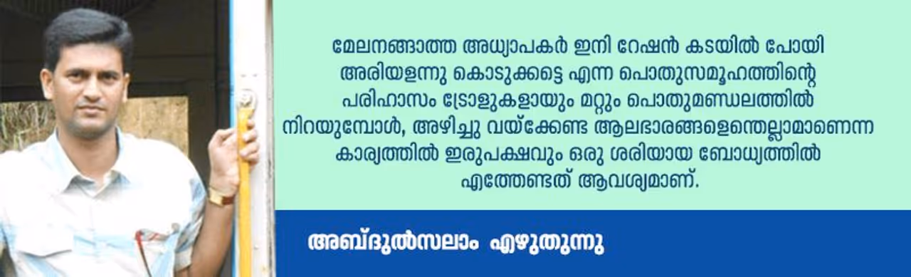 മേലനങ്ങാത്ത അധ്യാപകര് ഇനി റേഷന് കടയില് പോയി അരിയളന്നു കൊടുക്കട്ടെ എന്ന പൊതുസമൂഹത്തിന്റെ പരിഹാസം ട്രോളുകളായും മറ്റും പൊതുമണ്ഡലത്തില് നിറയുമ്പോള്, അഴിച്ചു വയ്ക്കേണ്ട ആലഭാരങ്ങളെന്തെല്ലാമാണെന്ന കാര്യത്തില് ഇരുപക്ഷവും ഒരു ശരിയായ ബോധ്യത്തില് എത്തേണ്ടത് ആവശ്യമാണ്.