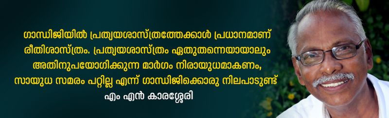 ഒരു പ്രത്യയശാസ്ത്രം ഉണ്ടാക്കിയ ശേഷം പ്രവർത്തനം തുടങ്ങിയ ആൾ അല്ല ഗാന്ധിജി. മാർക്സ് അങ്ങനെയാണ്. എന്നാൽ, ഗാന്ധിജിയുടെ പ്രത്യയശാസ്ത്രമെന്നത് അദ്ദേഹത്തിന്റെ പ്രവർത്തനങ്ങളിലൂടെ പതുക്കെപ്പതുക്കെ ഉണ്ടായി വരുന്ന ഒന്നാണ്.