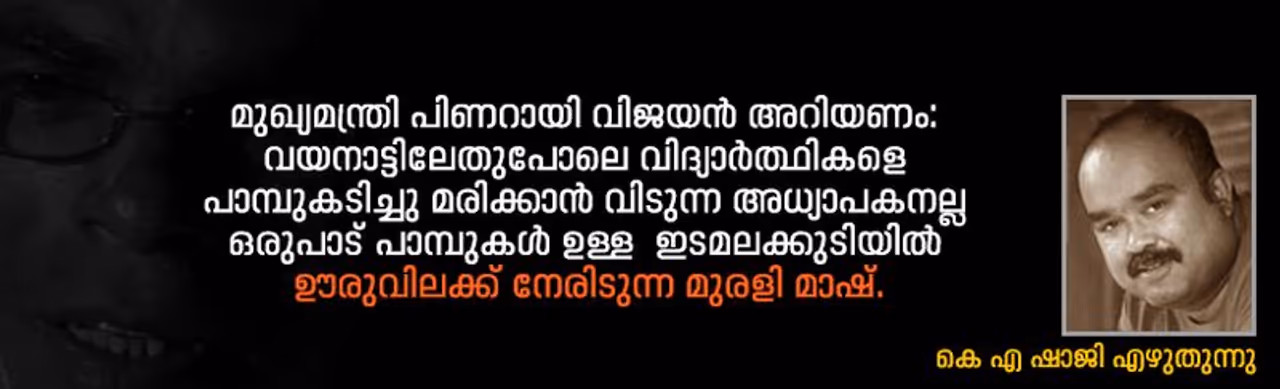 വയനാട്ടിലെ സുൽത്താൻ ബത്തേരിയിൽ നിന്നും ഇടുക്കിയിലെ ഇടമലക്കുടിയിലേക്ക് കാട്ടിലൂടെയുള്ള ദൂരം കുറവായിരിക്കും. എങ്കിലും ബത്തേരിയിലെ സർവജന സർക്കാർ സ്കൂളിൽ പാമ്പുകടിയേറ്റ കുട്ടിയെ അലംഭാവം കൊണ്ട് മരിക്കാൻ വിട്ട സി പി ഷാജിലിൽ നിന്നും ഇടമലക്കുടിയിൽ തന്റെ തുച്ഛശമ്പളം പോലും ആദിവാസിക്കുട്ടികൾക്കായി ചെലവിട്ട് ജീവിക്കുന്ന മുരളി മാഷിലേയ്ക്ക് ഒരുപാട് ദൂരമുണ്ട്. ആ ദൂരം മനസ്സിലാകാത്ത ഭരണാധികാരികളുടെ കനിവും കാത്താണ് മുരളി മാഷ് ഒരാഴ്ചയായി തിരുവനന്തപുരത്ത് തങ്ങുന്നത്. നീതി ഉറപ്പിച്ചു തരേണ്ടവർ മുഖം തിരിച്ചു നടന്നു പോകുമ്പോൾ അദ്ദേഹത്തിന്റെ മുന്നിൽ ഇനിയെന്തു ചെയ്യണം എന്ന അനിശ്ചിതത്വം ഉണ്ട്. വയനാട്ടിൽ ഉള്ളതിലധികം പാമ്പുകൾ ഇടമലക്കുടിയിലുണ്ട്. എന്നാൽ വിദ്യാർത്ഥികളെ പാമ്പുകടിച്ചു മരിക്കാൻ വിട്ട ആളല്ല തുച്ഛ ശമ്പളമുള്ള മുരളി മാഷ്. അയാൾക്ക് വിദ്യാർത്ഥികൾ അല്ലാതെ ഒരു ജീവിതമില്ല. നാല് ഏകാധ്യാപക വിദ്യാലയങ്ങൾ ഒന്നിച്ചു ചേർത്ത് ഒരു മുഴുവൻ സ്കൂളാക്കി അവിടെ കുട്ടികൾക്ക് താമസിച്ചു പഠിക്കാൻ വരെ വഴിയുണ്ടാക്കിയ ആൾ. ഉച്ചഭക്ഷണം സർക്കാർ നൽകുമ്പോൾ മറ്റുനേരങ്ങളിലെ ഭക്ഷണത്തിന്റെ ചെലവ് തന്റെ നിസ്സാര ശമ്പളത്തിൽ നിന്ന് കണ്ടെത്തിയ ഒരാൾ.