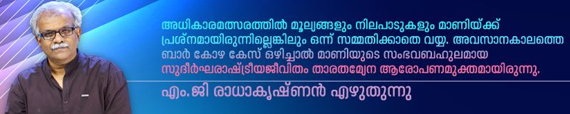 അധികാരമത്സരത്തില് മൂല്യങ്ങളും നിലപാടുകളും മാണിയ്ക്ക് പ്രശ്നമായിരുന്നില്ലെങ്കിലും ഒന്ന് സമ്മതിക്കാതെ വയ്യ. അവസാനകാലത്തെ ബാര് കോഴ കേസ് ഒഴിച്ചാല് മാണിയുടെ സംഭവബഹുലമായ സുദീര്ഘരാഷ്ട്രീയജീവിതം താരതമ്യേന ആരോപണമുക്തമായിരുന്നു. ദേശീയ കക്ഷികളായ കോണ്ഗ്രസ്സ്, സി പി എം കക്ഷികളുടെ കീഴില് ധ്രുവീകരിക്കപ്പെട്ടതാണ് കേരള രാഷ്ട്രീയം. സമീപകാലത്ത് ഇതിനു വെല്ലുവിളി ഉയര്ത്തിയ ബി ജെ പിയും ദേശീയകക്ഷിയാണ്. 1990 -കള് മുതല് ഇന്ത്യയിലെ മിക്ക സംസ്ഥാനങ്ങളിലും പ്രാദേശിക കക്ഷികളുടെ വളര്ച്ചയും പ്രാദേശിക ആവശ്യങ്ങളെചൊല്ലി ദേശീയകക്ഷികളോട് വിലപേശലും ഒക്കെ നടന്നു. കേരളത്തില് ഒരു ഫെഡറല്-പ്രാദേശികശക്തിയാക്കാനുള്ള സാധ്യതയുമായി ആയിരുന്നു കര്ഷകരുടെ കക്ഷിയായ കേരള കോണ്ഗ്രസ്സിന്റെ പിറവി. എന്നാല് അധികം വൈകാതെ ഒരു മതവിഭാഗത്തിന്റെ മാത്രം കക്ഷിയെന്ന പേരും സ്വാര്ഥലക്ഷ്യം മുന് നിര്ത്തി മാത്രം കര്ഷകപ്രശ്നം ഉയര്ത്തിയതും നേതാക്കളുടെ വ്യക്തിപരമായ അധികാരമോഹവും തല്ഫലമായ നിരന്തര പിളര്പ്പുകളും ദേശീയതലത്തില് കേരളത്തിനു വേണ്ടി വിലപേശുന്ന ഒരു പ്രാദേശിക കക്ഷിയാകാനുള്ള സാധ്യത അടച്ചുകളയുകയായിരുന്നു. മറ്റാരേക്കാളും ഇതിന്റെയും ഒന്നാം കാരണക്കാരന് മാണി തന്നെ.
