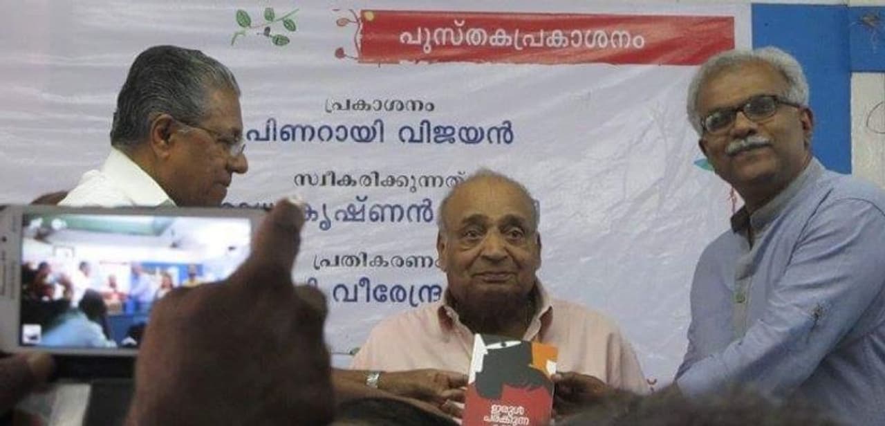 എം പി വീരേന്ദ്രകുമാര് എഴുതിയ 'ഇരുള് പടരും കാലം' എന്ന പുസ്തകം മുഖ്യമന്ത്രി പിണറായി വിജയനില് നിന്ന് ഏഷ്യാനെറ്റ് ന്യൂസിന്റെ എഡിറ്റര് എം ജി രാധാകൃഷ്ണന് ഏറ്റുവാങ്ങുന്നു