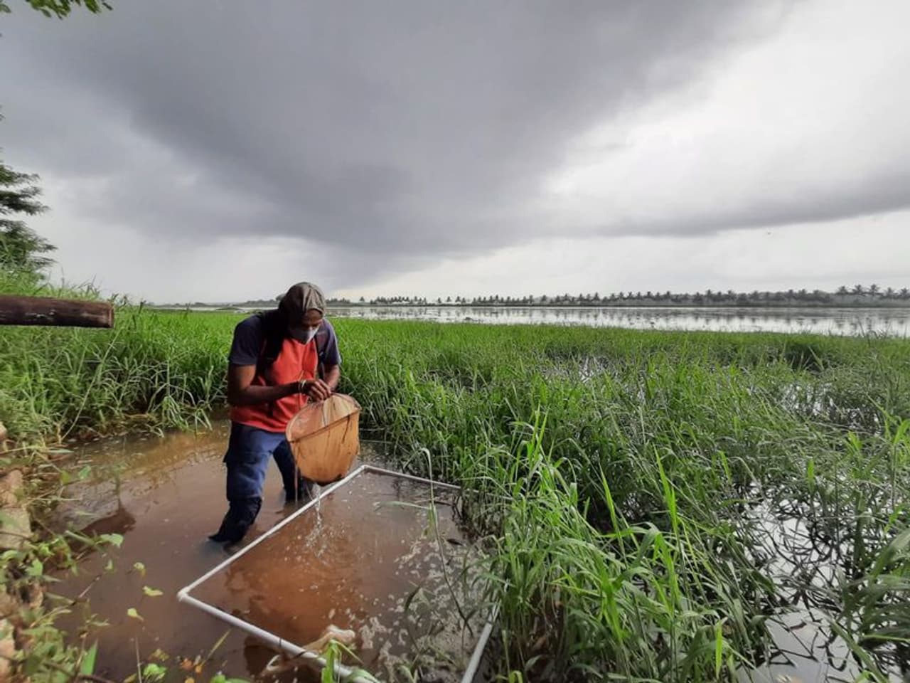 (പച്ചക്കണ്ണന് ചേരാച്ചിറകന്റെ ലാര്വകളെ കുറിച്ചുള്ള പഠനത്തില് ഏര്പ്പെട്ടിരിക്കുന്ന വിവേക് ചന്ദ്രന്)