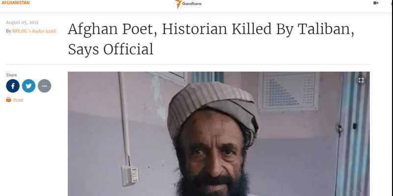 ''താലിബാന് അഫ്ഗാനിസ്താനില് ഒരു കവിയെ കൂടി വധിച്ചു. കവിയും ചരിത്രകാരനുമായ അബ്ദുല്ല ആതിഫിയെയാണ് പീഡനങ്ങള്ക്കു വിധേയമാക്കിയ ശേഷം താലിബാന് കൊല ചെയ്തത്. തെക്കന് അഫഗാനിസ്താനിലെ ഉറൂസ്ഗാന് പ്രവിശ്യാ ഗവര്ണര് മുഹമ്മദ് ഉമര് ഷിര്സാദ് ആണ് ഇക്കാര്യം അറിയിച്ചത്.''