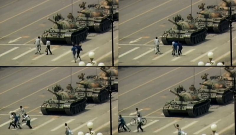 ടാങ്ക് നിർത്തി എന്നുകണ്ടപ്പോൾ അയാൾ അതിന്റെ മുകളിലേക്ക് വലിഞ്ഞു കയറി. ഓപ്പറേറ്ററുടെ ഹാച്ചിന് അടുത്തെത്തി അതിനുള്ളിലിരുന്ന പട്ടാളക്കാരനോട് എന്തോ പറഞ്ഞു. എന്നിട്ട് താഴേക്കിറങ്ങി. ടാങ്കിന്റെ ഹാച്ച് തുറക്കുന്നതും ടാങ്ക് കമാണ്ടർ തല പുറത്തേക്കിട്ടു നോക്കുന്നതും ഒക്കെ കാണാം. അതിനു ശേഷം ടാങ്കുകളുടെ എഞ്ചിൻ വീണ്ടും സ്റ്റാർട്ടാവുന്നു. വീണ്ടും അവ മുന്നോട്ടു പോവാൻ ശ്രമിക്കുന്നു എന്ന് കണ്ടപ്പോൾ അയാൾ വീണ്ടും ആ വ്യൂഹത്തിനു മുന്നിലേക്ക് എടുത്തുചാടി തന്റെ ധർണ തുടരുന്നു.