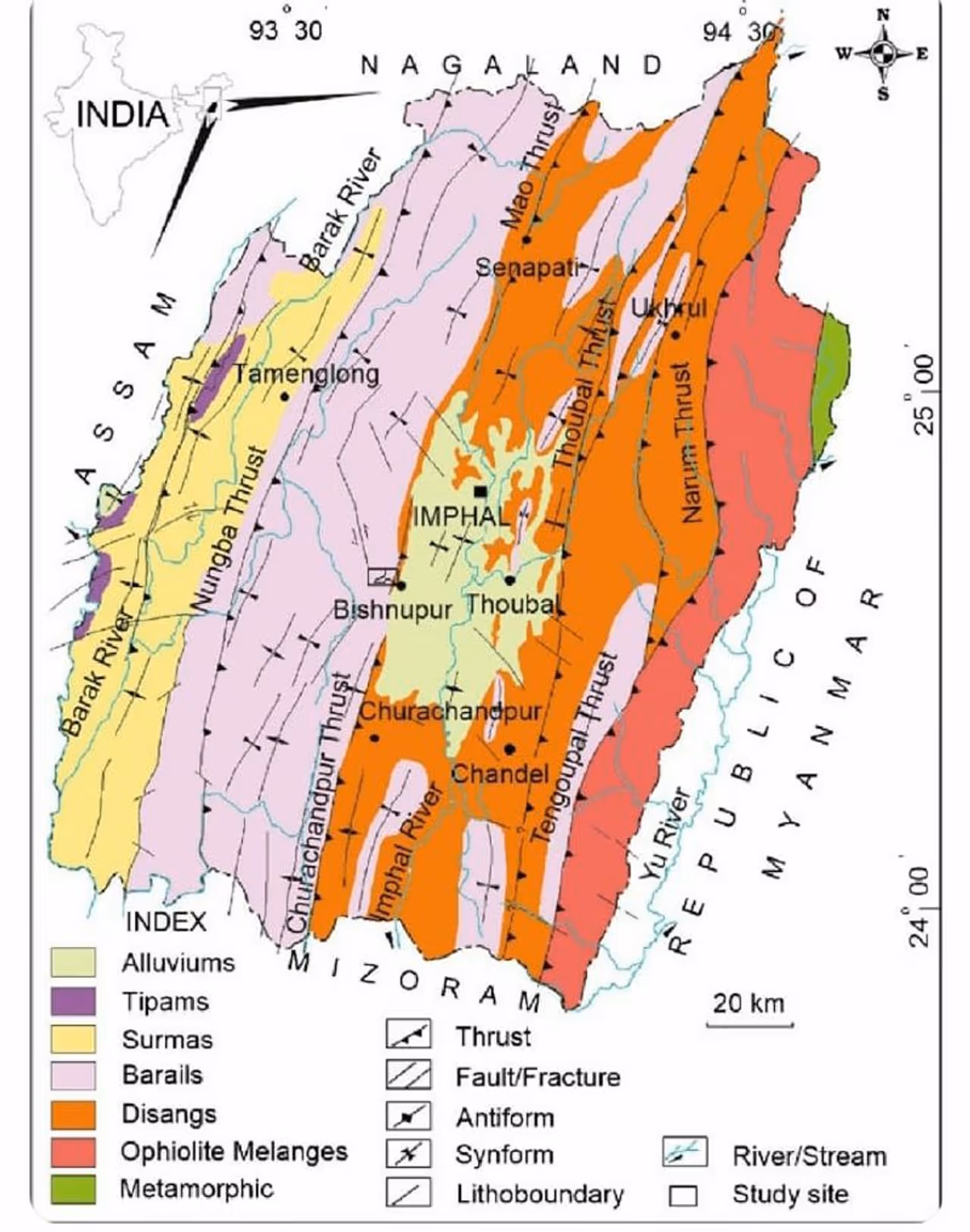 മണിപ്പൂരിന്റെ ഏതാണ്ട് 58 ശതമാനം സ്ഥലങ്ങളിലേ ക്രമീകൃത ജിയോളജിക്കൽ മാപ്പിങ്ങ് നടത്തിയിട്ടുള്ളൂ. അതിൽ ഉക്രൂൽ, ചാന്ദേൽ ജില്ലകളാണ് ഏറ്റവും ധാതുസമ്പന്നം. ഇവിടങ്ങളിലെല്ലാം പ്രധാനമായും നാഗാ, സോ, കുക്കി വിഭാഗങ്ങളും പ്രാദേശിക ഗോത്രങ്ങളും ആണ് താമസിക്കുന്നത്.