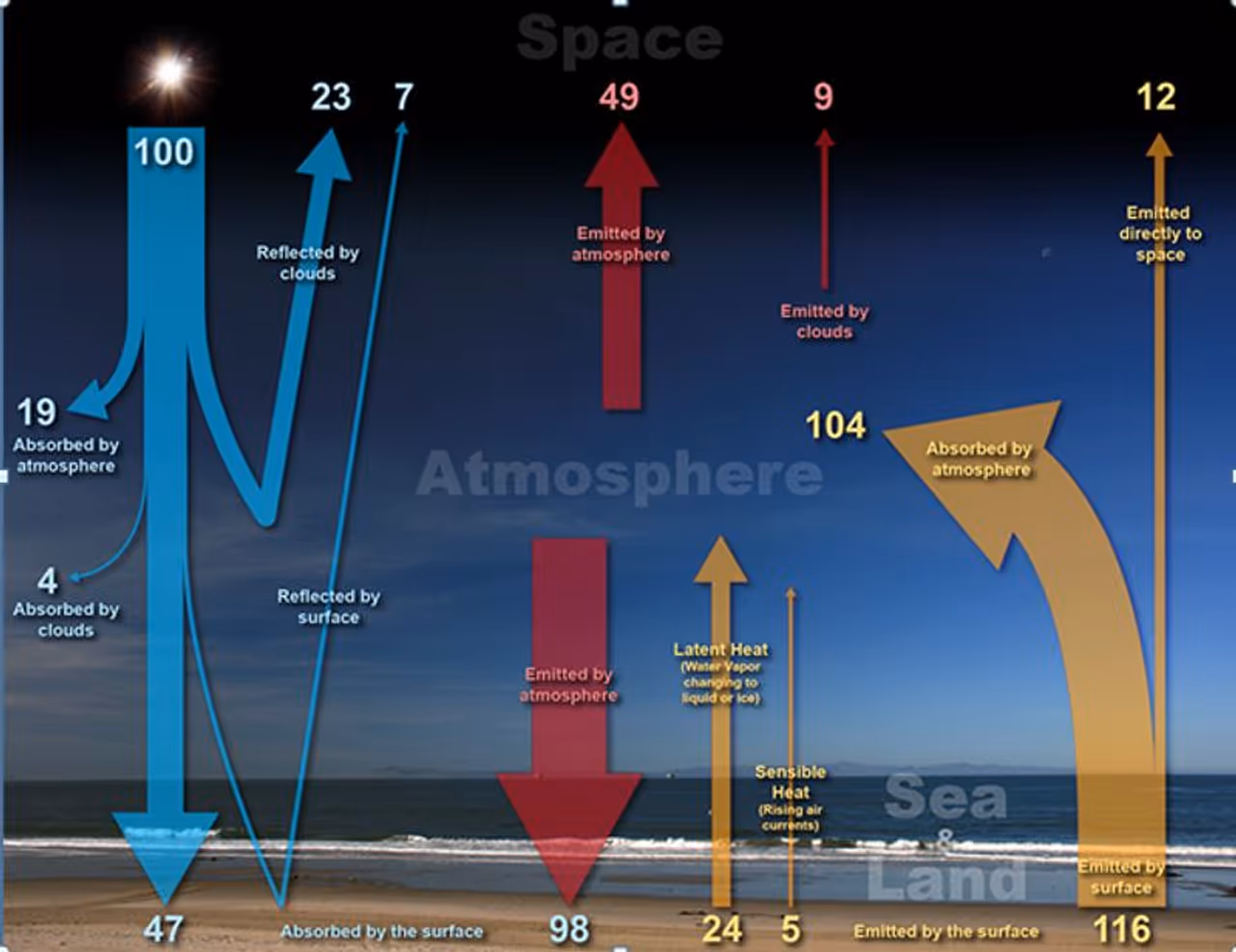 1. സൂര്യനില് നിന്നുള്ള വികിരണങ്ങളുടെ ആഗിരണ- പ്രസരണ തോതുകള് (Radiative Flux Transfer of Atmosphere). താഴെ കൊടുത്തിരിക്കുന്ന ചിത്രം ഇതിന്റെ കണക്കുകള് ആണ് കാണിക്കുന്നത്.