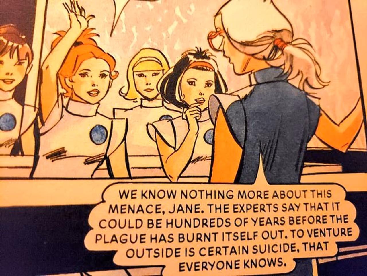 ജെയിനും ജീനും ജീവിക്കുന്നത് ഒരു ഫോഴ്സ് ഫീല്ഡിലാണ്. അതവരെ വൈറസില് നിന്നും സംരക്ഷിക്കുന്നു. പുറംലോകവുമായുള്ള എല്ലാ ബന്ധവും വിച്ഛേദിച്ചിരിക്കുകയാണ്. നഗരങ്ങളില്നിന്നും നഗരങ്ങളിലേക്കും മറ്റ് രാജ്യങ്ങളിലേക്കും യാത്ര ചെയ്യുന്നതിന് വിലക്കുണ്ട്. അവരുടെ അധ്യാപിക അവരോട് പറയുകയാണ്, ഒരു ഭയങ്കരമായ പ്ലേഗ് ഉണ്ടായിരിക്കുകയാണ്. മില്ല്യണ് കണക്കിന് ആളുകള് മരിച്ചു. നമ്മുടെ ജീവന് രക്ഷിക്കുന്ന ഈ ഫോഴ്സ് ഫീല്ഡിനോട് നാം നന്ദി പറയണമെന്ന്.