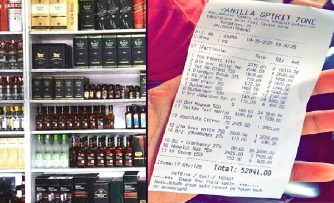 ചിലയിടങ്ങളിൽ തിരക്ക് നിയന്ത്രിക്കാൻ പൊലീസിന് ലാത്തി വീശേണ്ടിവന്നത് വാർത്തയായെങ്കിൽ, മറ്റു ചിലയിടങ്ങളിൽ കൗതുകമായത് അരലക്ഷത്തിലധികം രൂപയുടെ മദ്യം വാങ്ങിയതിന്റെ ഒറ്റ ബില്ലാണ്.