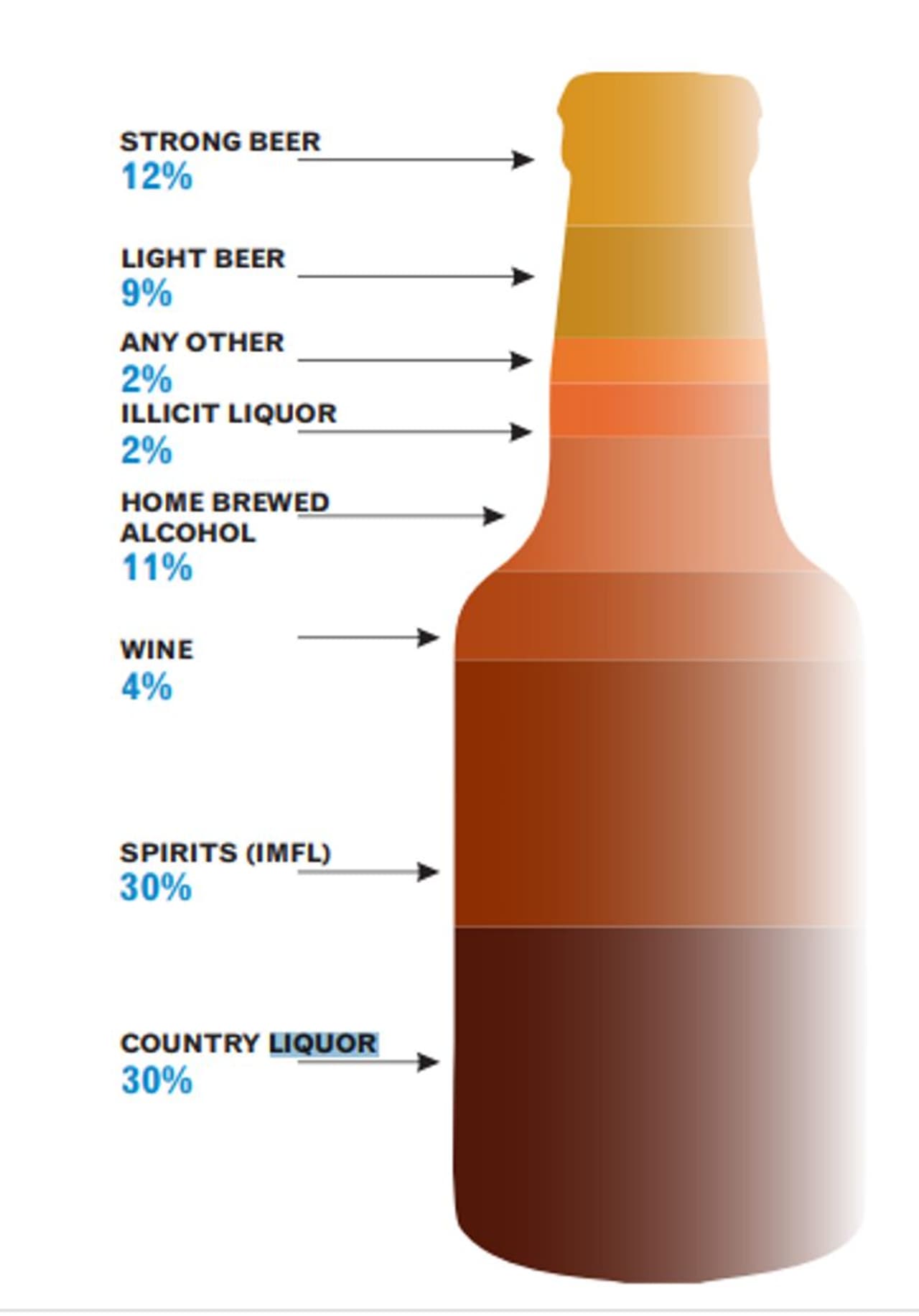 സർക്കാർ സംവിധാനത്തിലൂടെ താങ്ങാവുന്ന വിലക്ക് നല്ല മദ്യം കിട്ടുന്നില്ല എന്ന പരാതിയുള്ള പലരും, ആകെ കുടിയന്മാരുടെ നല്ലൊരു ശതമാനത്തിനും വിദേശ മദ്യത്തേക്കാൾ പ്രിയം, പ്രാദേശികമായി നിർമ്മിച്ചെടുക്കുന്ന വീര്യമേറിയ നാടൻ വാറ്റാണ്. കഴിഞ്ഞ മൂന്നുപതിറ്റാണ്ടിലെ മദ്യത്തിന്റെ ശരാശരി ഉപഭോഗവും ഏകദേശം 38 ശതമാനത്തോളം വർധിച്ചിട്ടുണ്ട് എന്നാണ് പഠനങ്ങൾ പറയുന്നത്. ഇന്ത്യൻ പൗരന്മാരുടെ മദ്യത്തിന്റെ ശരാശരി വാർഷിക ഉപഭോഗം 4.3 ലിറ്ററിൽ നിന്ന് 5.9 ലിറ്റർ ആയി വർദ്ധിച്ചിട്ടുണ്ടത്രെ. മദ്യം ജനങ്ങൾക്ക് താങ്ങാവുന്ന വിലയിൽ രാജ്യത്ത് ലഭ്യമായിട്ടുണ്ട് എന്നതാണ് ഇങ്ങനെ ഉപഭോഗത്തിന്റെ അളവ് കൂടാനുള്ള കാരണം എന്ന് ഗവേഷകർ പറയുന്നു.