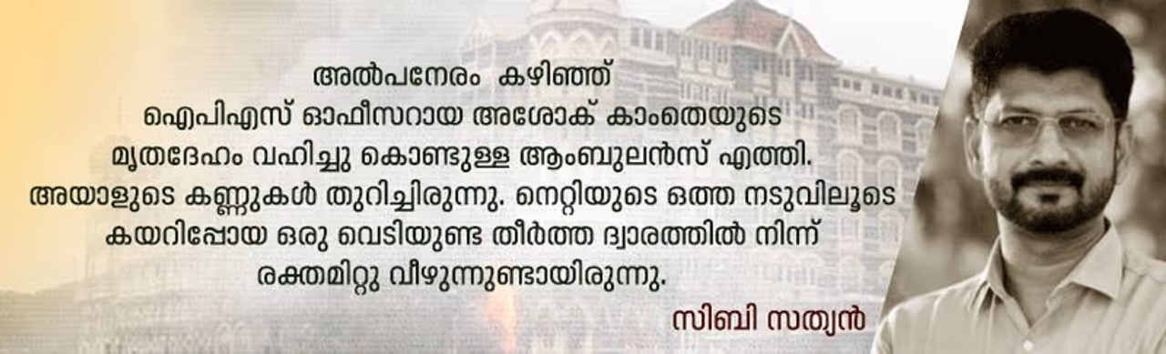 എല്ലാ പ്രതീക്ഷയും അസ്തമിച്ച രാത്രി. അല്പനേരം കഴിഞ്ഞ് ഐപിഎസ് ഓഫീസറായ അശോക് കാംതെയുടെ മൃതദേഹം വഹിച്ചു കൊണ്ടുള്ള ആംബുലന്സ് എത്തി. അയാളുടെ കണ്ണുകള് തുറിച്ചിരുന്നു. നെറ്റിയുടെ ഒത്ത നടുവിലൂടെ കയറിപ്പോയ ഒരു വെടിയുണ്ട തീര്ത്ത ദ്വാരത്തില് നിന്ന് രക്തമിറ്റു വീഴുന്നുണ്ടായിരുന്നു. മരണത്തിനും ജീവിതത്തിനും വെടിയുണ്ടകള്ക്കുമിടയില് നിന്ന് ആംബുലന്സ് സര്വീസുകാര് മാത്രം ആരെയൊക്കെയോ വാരിപ്പിടിച്ചു കൊണ്ടുവന്നുകൊണ്ടേയിരുന്നു.