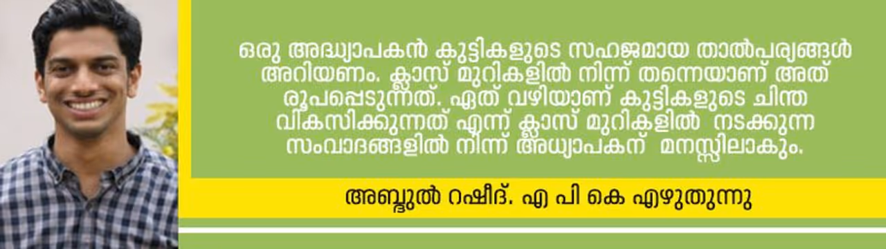 ഓൺലൈൻ ക്ലാസുകളെ കുറിച്ചുള്ള സജീവമായ ചർച്ചയാണ് ഇപ്പോൾ എല്ലായിടത്തും. കുട്ടികൾ നൈസർഗികമായ സ്വഭാവസവിശേഷതയുള്ളവരാണ്. അവയെ മൂടുപടമില്ലാതെ, ജനാധിപത്യത്തിന്റെ വെളിച്ചത്തിൽ, സ്വാഭാവികമായി വികസിപ്പിക്കേണ്ടതുമാണ്. ഒരു അദ്ധ്യാപകൻ എന്ന് പറയുന്നത് 'പഠിപ്പിക്കുന്ന' ആൾ മാത്രമല്ല, തന്റെ മുമ്പിലുള്ള കുട്ടികളെ കൂടി അറിയുന്നയാളാണ്. ഒരു കുട്ടിയെ പരസ്പരം കാണുകയും അറിയുകയും ചെയ്യുമ്പോഴാണ് ആശയം വിനിമയം ചെയ്യപ്പെടുന്നത്. ക്ലാസ് മുറി ഭാവമൂല്യങ്ങൾ കൂടി പ്രസരിപ്പിക്കുന്ന ഇടമാണ്. gender equality ഉറപ്പുവരുത്തുവാൻ ഓൺലൈൻ ക്ലാസ് മുറികൾക്ക് സാധിക്കുമോ? തുല്യത എന്നുള്ളത് എല്ലാവരും കേൾവിക്കാർ ആവുന്നു എന്നതിലേക്ക് ചുരുങ്ങും.