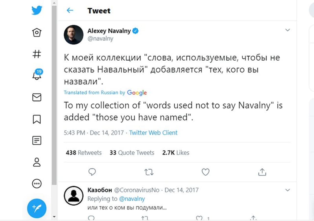 കാലം കഴിയുന്തോറും തന്റെ രാഷ്ട്രീയ എതിരാളിയുടെ പേര് പരാമർശിക്കാനുള്ള പുടിന്റെ വിമുഖത ഏറിവരികയാണ് ചെയ്യുന്നത്. ഒരിക്കൽ ഒരു പത്രസമ്മേളനത്തിൽ വെച്ച് ഒരു മാധ്യമപ്രവർത്തകൻ നേരിട്ട് നവൽനിയെപ്പറ്റി ചോദിച്ചപ്പോൾ പുടിൻ പറഞ്ഞത്,"നിങ്ങളിപ്പോൾ പറഞ്ഞയാൾ, അയാൾ സാകഷ്വിലിയെപ്പോലെയാണ്. അയാളുടെ റഷ്യൻ വേർഷൻ മാത്രമാണ് ഇയാൾ" എന്നായിരുന്നു. പുടിൻ പറഞ്ഞത് നവൽനി ജോർജിയയിലെ പ്രസിഡന്റ് മിഖയിൽ സാകഷ്വിലിയെപ്പോലെയാണ് എന്നായിരുന്നു. ആ പ്രസ് കോൺഫറൻസ് തീർന്നയുടനെ നവൽനി പുടിനെ ലക്ഷ്യമിട്ട് ഒരു ട്വീറ്റ് ഇട്ടിരുന്നു. "എന്റെ പേരൊഴിവാക്കാൻ വേണ്ടി പറയപ്പെടുന്ന വാക്കുകളുടെ പട്ടികയിലേക്ക് ഇന്നുമുതൽ 'നിങ്ങളിപ്പോൾ പറഞ്ഞയാൾ' എന്ന സംജ്ഞ ചേർക്കുകയാണ്." എന്നായിരുന്നു ആ ട്വീറ്റിലെ പരിഹാസം.