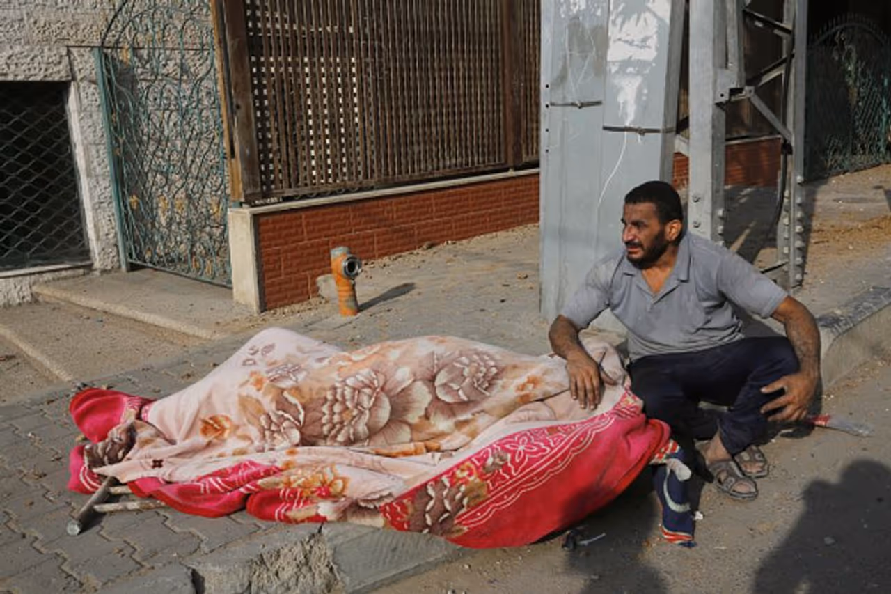 ഗാസയിലെ അല് കറാമയില് ഇസ്രയേല് നടത്തിയ വ്യോമാക്രമണത്തില് തകര്ന്ന കെട്ടിടങ്ങള്ക്കരികെ ഉറ്റബന്ധുവിന്റെ മൃതദേഹത്തിന് കാവലിരിക്കുന്ന പലസ്തീന് യുവാവ്. (Photo: Ashraf Amra/Anadolu via Getty Images)