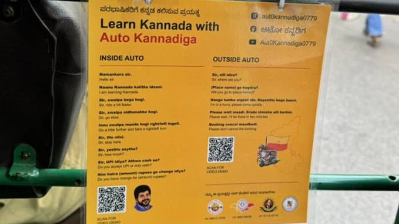 അത്തരമൊരു സാഹചര്യത്തിലാണ് ഈ ഓട്ടോയും ഓട്ടോ ഡ്രൈവറും സോഷ്യൽ മീഡിയയിൽ വൈറലായിക്കൊണ്ടിരിക്കുന്നത്. ഓട്ടോയിൽ യാത്ര ചെയ്യുന്നതിനിടയിൽ അത്യാവശ്യം ആവശ്യം വരുന്ന കന്നഡയാണ് ഓട്ടോയിൽ എഴുതി വച്ചിരിക്കുന്നത്. കന്നഡ പഠിക്കാം ഓട്ടോ കന്നഡിഗയിലൂടെ എന്നാണ് ഇതിൽ പറഞ്ഞിരിക്കുന്നത്. കന്നഡ അറിയാത്തവർക്ക് യാത്രക്കിടയിലും യാത്ര കഴിഞ്ഞും ആവശ്യമായി വരുന്ന അത്യാവശ്യം ചില കന്നഡ വാക്കുകളാണ് ഇതിൽ എഴുതിയിരിക്കുന്നത്.
