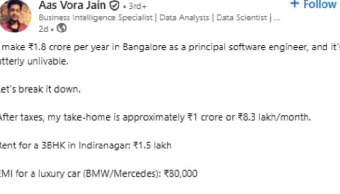 എത്രയൊക്കെ കാശുണ്ടായാലും ചെലവ് കഴിയുമ്പോൾ ഒന്നും ഇല്ലാതെയാകും എന്ന് മിക്കവരും പറയാറുണ്ട്. എന്നാൽ, ലിങ്ക്ഡ്ഇന്നിലുള്ള ഈ പോസ്റ്റ് ആളുകളെ അല്പം ആശയക്കുഴപ്പത്തിലാക്കിയിട്ടുണ്ട്. ബെംഗളൂരുവിൽ നിന്നുള്ള 'പ്രിൻസിപ്പൽ സോഫ്റ്റ്വെയർ എഞ്ചിനീയർ' പറയുന്നത് 1.8 കോടി വർഷത്തിൽ ശമ്പളം കിട്ടുമെങ്കിലും ഒന്നിനും തികയുന്നില്ല എന്നാണ്.