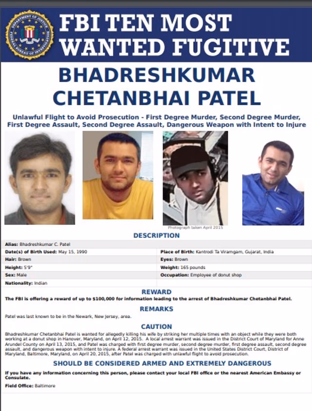 ഗുജറാത്തിലെ വിരംഗം സ്വദേശിയായ പട്ടേൽ ഇന്ന് എഫ്ബിഐയുടെ ടോപ്പ് ടെൻ ഫ്യൂജിറ്റീവ്സ് ലിസ്റ്റിൽ ഉൾപ്പെട്ടിരിക്കുന്ന ഏക ഇന്ത്യൻ വംശജനാണ്. കൊടും ഭീകരനാണ് പട്ടേലെന്നാണ് എഫ്ബിഐയുടെ ഭാഷ്യം. മേരിലാൻഡിലെ ഹാനോവറിൽ വെച്ച് സ്വന്തം ഭാര്യയെ കൊന്നുകളഞ്ഞു എന്നതാണ് ഭദ്രേഷിനുമേൽ ആരോപിക്കപ്പെട്ടിരിക്കുന്ന കുറ്റം. ടോപ്പ് ടെൻ ലിസ്റ്റിൽ 2017 മുതൽ പട്ടേലിന്റെ സാന്നിധ്യമുണ്ടായിരുന്നിട്ടും, അമേരിക്കയിലെ രഹസ്യപൊലീസ് സംവിധാനങ്ങൾ എല്ലാം ഒന്നിച്ചു പരിശ്രമിച്ചിട്ടും പട്ടേലിന്റെ രോമത്തിൽ പോലും ഒന്ന് തൊടാൻ അവർക്കായിട്ടില്ല. അതുകൊണ്ടാണ് ഇക്കൊല്ലം, ഇന്ത്യൻ രഹസ്യാന്വേഷണ ഏജൻസികളുടെ കൂടി സഹകരണം അഭ്യർത്ഥിച്ചുകൊണ്ട് എഫ്ബിഐ രംഗത്തെത്തിയത്.
