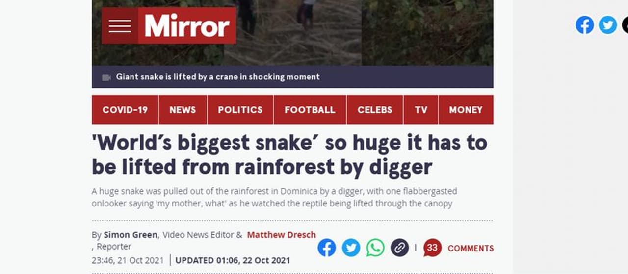 അതിനിടെയാണ്, ഇതേ വീഡിയോ ലോകത്ത് മറ്റിടങ്ങളില് പ്രത്യക്ഷപ്പെട്ടതായി വാര്ത്ത വന്നത്. കരീബിയന് മഴക്കാടുകളില് നിന്ന് ലോകത്തെ ഏറ്റവും വലിയ പാമ്പുകളില് ഒന്നിനെ ക്രെയിന് ഉപയോഗിച്ച് പൊക്കിയെടുക്കുന്നു എന്നായിരുന്നു വാര്ത്ത. ഫഖ്റുല് അസ്വ എന്നയാള് ടിക്ടോക്കില് കഴിഞ്ഞ ആഴ്ചയാണ് ഈ വീഡിയോ പോസ്റ്റ് ചെയ്തത്. ഇതോടൊപ്പം ഇതേ പാമ്പിനെ വാഹനത്തിലേക്ക് കയറ്റുന്ന മറ്റൊരു വീഡിയോയും ഇയാള് പോസ്റ്റ് ചെയ്തിട്ടുണ്ട്. ടിക്ടോക്കില് മാത്രം 79 ദശലക്ഷം പേര് ഇത് കണ്ടതായാണ് ബ്രിട്ടീഷ് ടാബ്ലോയിഡായ മിറര് റിപ്പോര്ട്ട് ചെയ്തത്. കരീബിയന് ദ്വീപിലുള്ള ഡൊമിനിക്കയില് കണ്ടെത്തിയ 10 അടി നീളമുള്ള പാമ്പിനെ ക്രെയിന് ഉപയോഗിച്ച് പൊക്കിയെടുക്കുന്നു എന്നാണ് മിറര് അടക്കം പല ടാബ്ലോയിഡുകളും കൊടുത്ത വാര്ത്തയിലുള്ളത്. ടിക്ടോക്കര് അവകാശപ്പെടുന്നതിനപ്പുറം ഈ സ്ഥലത്തെ കുറിച്ചോ എന്നാണ് ഈ പാമ്പിനെ പിടികൂടിയതെന്നോ ഉള്ള കാര്യത്തില് ഈ വാര്ത്തകളിലും കൃത്യമായ സൂചനകള് ഒന്നുമില്ല.