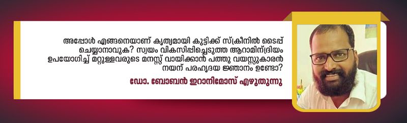അപ്പോൾ എങ്ങനെയാണ് കൃത്യമായി കുട്ടിക്ക് സ്ക്രീനിൽ ടൈപ്പ് ചെയ്യാനാവുക? സ്വയം വികസിപ്പിച്ചെടുത്ത ആറാമിന്ദ്രിയം ഉപയോഗിച്ച് മറ്റുള്ളവരുടെ മനസ്സ് വായിക്കാൻ പത്തു വയസ്സുകാരൻ നയന് പരഹൃദയ ജ്ഞാനം ഉണ്ടോ (Telepathy). ഇന്ദ്രിയ സഹായമില്ലാതെ മറ്റൊരാളുടെ മനോഗതം സ്വമനസ്സിലുദിക്കൽ എന്നത് ആണോ നയന്റെ കാര്യത്തിൽ സംഭവിച്ചത്? ഇങ്ങനെയൊക്കെയുള്ള കുറേ ചോദ്യങ്ങൾ വീഡിയോ കണ്ട നമ്മുടെയൊക്കെ മനസ്സിൽ ഉണ്ടായിട്ടുണ്ടാകാം.