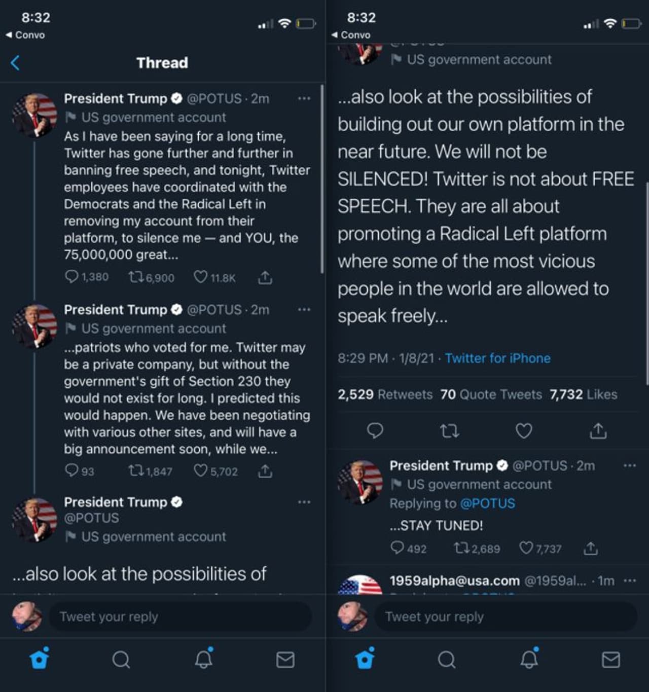 ആ ട്വീറ്റിൽ ട്രംപ് ഇങ്ങനെ പറഞ്ഞു, "ഇങ്ങനെ ഒന്നുണ്ടാകും എന്ന് പ്രതീക്ഷിച്ചിരുന്നു. ഞങ്ങൾ മറ്റു പല വെബ്സൈറ്റുകളുമായി ചർച്ചയിലാണ്. ഉടനെ ഒരു വലിയ പ്രഖ്യാപനം നിങ്ങൾക്ക് പ്രതീക്ഷിക്കാം. സമീപ ഭാവിയിൽ തന്നെ ഞങ്ങളുടേതായ ഒരു സോഷ്യൽ മീഡിയ പ്ലാറ്റ്ഫോം കെട്ടിപ്പടുക്കുന്നതിനെപ്പറ്റിയും ആലോചനകളുണ്ട്. എന്തായാലും, ഞങ്ങളെ നിശ്ശബ്ദരാക്കാൻ കഴിയില്ല എന്ന് ഉറപ്പിച്ചു പറയുന്നു."