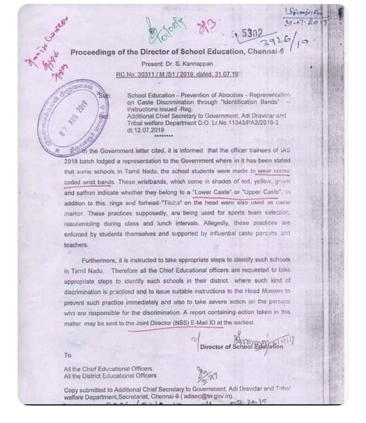 2018 -ലെ ഐഎഎസ് ട്രെയിനികളുടെ ഒരു സംഘമാണ് ഗവണ്മെന്റിന് ഇതുമായി ബന്ധപ്പെട്ട് നിവേദനം നല്കിയത്. തമിഴ്നാട്ടിലെ ചില സ്കൂളുകളിൽ ജാതിക്കനുസരിച്ച് പല നിറങ്ങളിലുള്ള ബാൻഡുകൾ കൈത്തണ്ടയിൽ ധരിക്കാൻ വിദ്യാർത്ഥികളെ നിർബന്ധിക്കുന്നതായി ഇതില് വ്യക്തമായി പരാമർശിച്ചിരുന്നു.