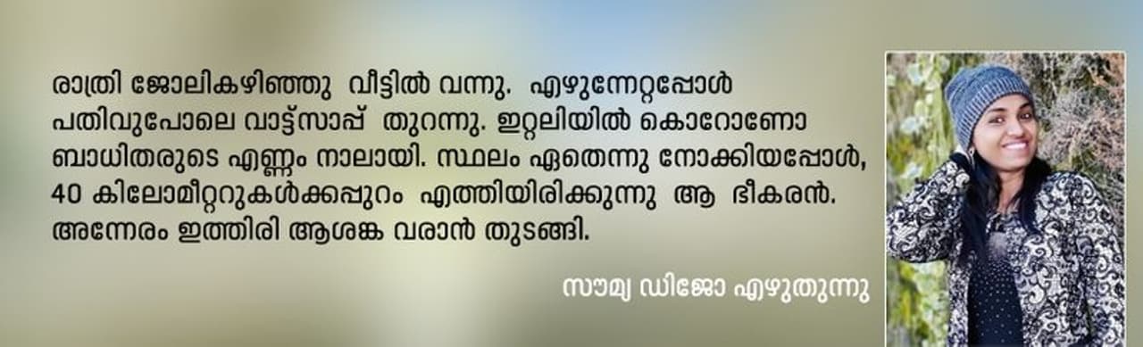 രാത്രി ജോലികഴിഞ്ഞു വീട്ടില് വന്നു. എഴുന്നേറ്റപ്പോള് പതിവുപോലെ വാട്ട്സാപ്പ് തുറന്നു. ഇറ്റലിയില് കൊറോണോ ബാധിതരുടെ എണ്ണം നാലായി. സ്ഥലം ഏതെന്നു നോക്കിയപ്പോള്, 40 കിലോമീറ്ററുകള്ക്കപ്പുറം എത്തിയിരിക്കുന്നു ആ ഭീകരന്. അന്നേരം ഇത്തിരി ആശങ്ക വരാന് തുടങ്ങി.