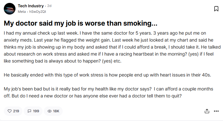 'ജോലി സമ്മർദ്ദം പുകവലിയെക്കാൾ മോശമാണ്' എന്ന് ഡോക്ടർ മുന്നറിയിപ്പ് നൽകിയതിനെ കുറിച്ച് ഒരു യുവാവ് ഷെയർ ചെയ്ത പോസ്റ്റാണ് ഇപ്പോൾ ശ്രദ്ധിക്കപ്പെടുന്നത്. ജോലിയിൽ നിന്നും ഒരു ഇടവേള എടുക്കാൻ തന്നോട് ഡോക്ടർ ആവശ്യപ്പെട്ടതായും ടെക്കിയായ യുവാവ് പറയുന്നു. ജോലിസ്ഥലത്തെ കാര്യങ്ങളെ കുറിച്ച് ചർച്ച ചെയ്യുന്ന ആപ്പായ Blind -ലാണ് പോസ്റ്റ് പ്രത്യക്ഷപ്പെട്ടിരിക്കുന്നത്. അഞ്ച് വർഷമായി താൻ സന്ദർശിക്കുന്ന ഡോക്ടറാണ് ഇക്കാര്യം പറഞ്ഞിരിക്കുന്നത്. താൻ എന്താണ് ചെയ്യേണ്ടത്? ജോലി ഒഴിവാക്കണോ അതോ ഡോക്ടറെ മാറ്റണോ എന്നതാണ് യുവാവിന്റെ സംശയം.
