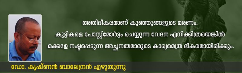 അത് ഈ കുട്ടികളുടെ മാതാപിതാക്കളുടെയും, നിർഭാഗ്യവശാൽ ഈ കുഞ്ഞുങ്ങളെ പോസ്റ്റ്മോര്ട്ടം ചെയ്യേണ്ടി വരുന്ന എന്റേയും മാത്രം അതിജീവനത്തിന്റെ പ്രശ്നമല്ല. കാരണം ഇതിന്റെ കാരണങ്ങൾ നമ്മളിലെന്നപോലെ നമുക്ക് ചുറ്റിലുമുണ്ട്.
