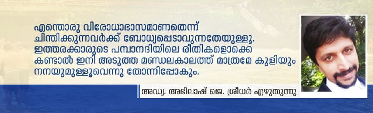 എന്തൊരു വിരോധാഭാസമാണതെന്ന് ചിന്തിക്കുന്നവർക്ക് ബോധ്യപ്പെടാവുന്നതേയുള്ളൂ. ഇത്തരക്കാരുടെ പമ്പാനദിയിലെ രീതികളൊക്കെ കണ്ടാൽ ഇനി അടുത്ത മണ്ഡലകാലത്ത് മാത്രമേ കുളിയും നനയുമുള്ളൂവെന്നു തോന്നിപ്പോകും. അത്രയ്ക്ക് വിശാലമാണ് ആ കുളിയും അതിനായി കരുതിക്കൊണ്ടുവരുന്ന ഷാംപൂവും സോപ്പും മറ്റ് സൗന്ദര്യവർദ്ധക വസ്തുക്കളും പുണ്യനദിയിലേക്ക് ഒഴുക്കിവിടുന്നതും, അത് മലീമസമാക്കാൻ അറിഞ്ഞോ അറിയാതെയോ ഭാഗമായിത്തീരുന്നതും.