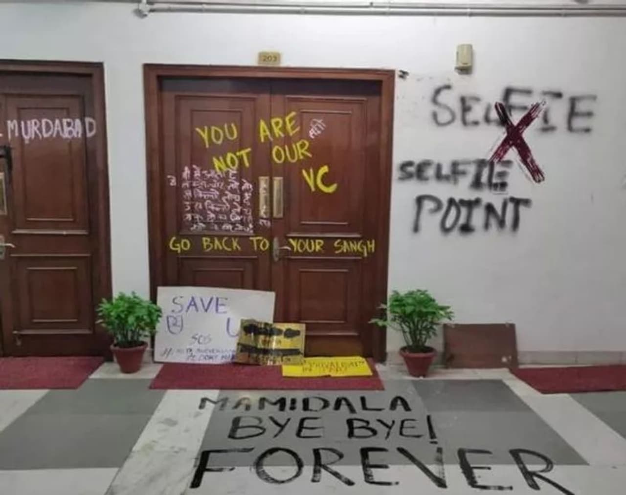 ഒന്നാമത്തെ വൈസ് ചാൻസലറുടെ പേര് എം ജഗദീഷ് കുമാർ. ജെഎൻയു വിസി. ഫീസിൽ ഉണ്ടായ കനത്ത വർദ്ധനവിനെത്തുടർന്നു ജെഎൻയുവിൽ നടന്ന വിദ്യാർത്ഥിസമരം പൊലീസ് വിദ്യാർത്ഥികളെ മർദ്ദിക്കുന്നതിലേക്ക് നയിച്ചിരുന്നു. കാഴ്ച പരിമിതരായ വിദ്യാർത്ഥികൾക്കുപോലും അന്ന് പൊലീസ് മർദ്ദനമേറ്റു. അവിടത്തെ വൈസ് ചാൻസലറായ എം ജഗദീഷ് കുമാർ വിദ്യാർത്ഥികളുടെ സമരം അടിസ്ഥാനരഹിതമാണെന്ന പക്ഷക്കാരനായിരുന്നു. പരീക്ഷ തുടങ്ങാനായി, ഇങ്ങനെ കാര്യമില്ലാത്ത കാര്യങ്ങൾക്ക് സമരം ചെയ്യുന്നത് കുട്ടികളുടെ ഭാവിയെ ബാധിക്കും എന്നും സമരം നിരുപാധികം നിർത്തി ക്ലാസില് കേറണം എന്നുമായിരുന്നു വിസിയുടെ നിലപാട്. അതേ സമയം തന്റെ വിദ്യാർത്ഥികളെ പൊലീസ് തല്ലിച്ചതച്ച വിഷയത്തിൽ ജഗദീഷ് കുമാറിൽ നിന്ന് ഒരു ചെറുവിരലനക്കം പോലുണ്ടായില്ല. ഇത് വിദ്യാർത്ഥികൾക്കിടയിൽ വിസിയുടെ പ്രതിച്ഛായ കാര്യമായ തോതിൽ ഇടിയുന്നതിന് കാരണമായിരുന്നു.