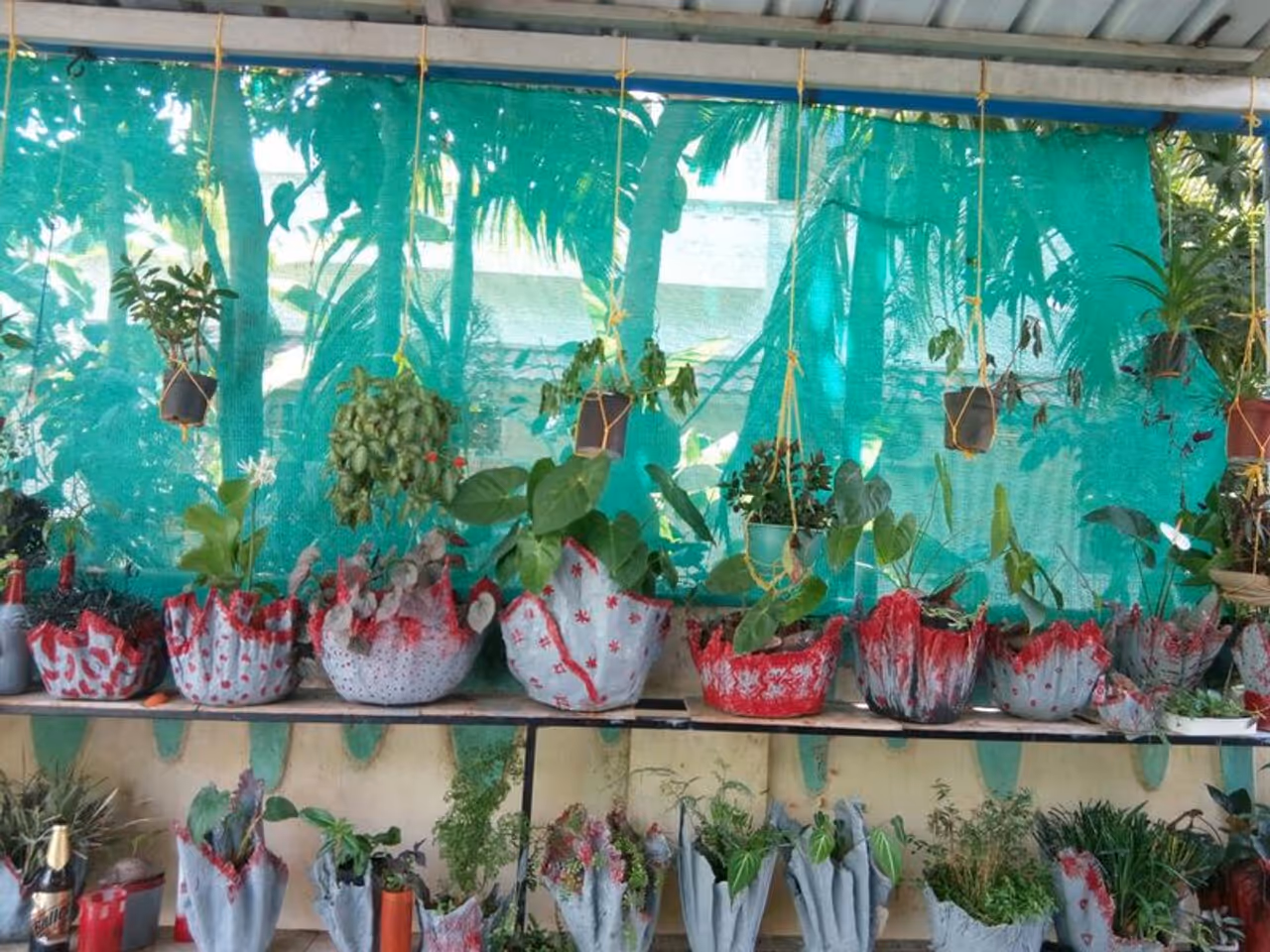 പ്ലാസ്റ്റിക് ബോട്ടിലുകള് ശേഖരിച്ച് മുറിച്ച് തിരിയിട്ട് സ്വന്തമായി വെള്ളം നനയ്ക്കുന്ന സെല്ഫ് വാട്ടറിങ്ങ് പോട്ടുകളും ഉണ്ടാക്കി വെച്ചിട്ടുണ്ട്.